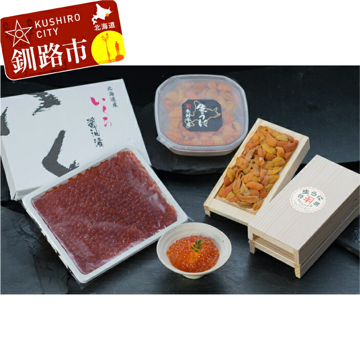 | 内容量 | ・えぞバフンうに塩水詰:100g×1 ・えぞバフンうにバラ盛(折詰):100g×1 ・いくら醤油漬け:400g×1 |