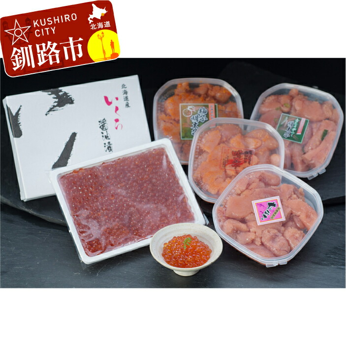 いくら醤油漬&たらこ(切子)&辛子明太子(切子)&柚子明太&青とうがらし明太詰合せ(北海道釧路市)