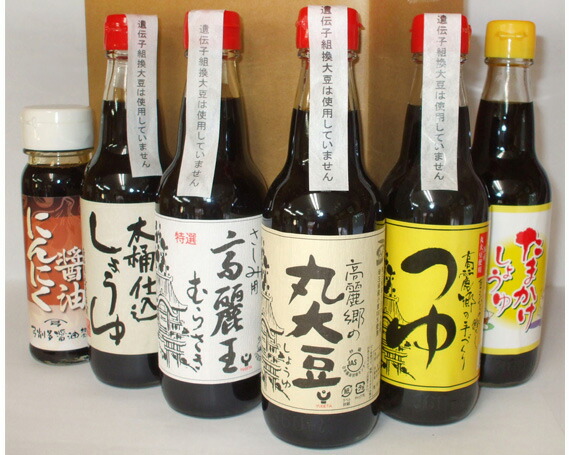 様々な料理に使い分けられる醤油の6本セットです。お刺身やお餅には「高麗王むらさき」、たまごかけごはんに「たまかけしょうゆ」などお好みの用途で使えます。