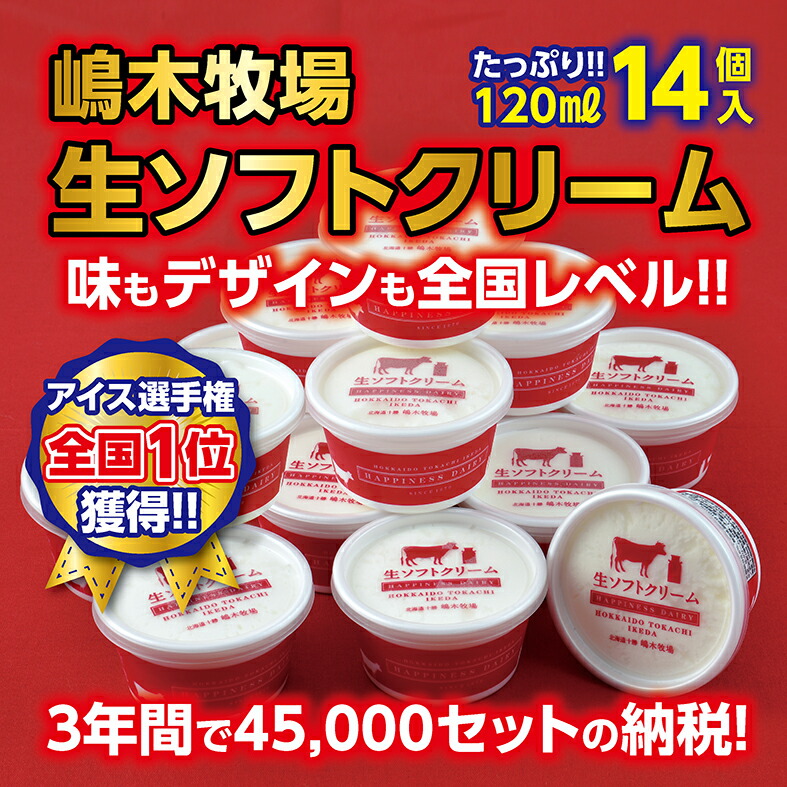 ハッピネスのおいしい手作りの生ソフトクリームの14個セットです。これは、池田町にある嶋木牧場の新鮮な生乳から作られています。ミルクの味が口の中に広がるこのソフトクリームには、生クリームと生乳を78%使用しています。この生乳の多さやなめらかな生クリームがおいしさの秘密です。過去には、2014年の「ニッポンふるさとアイス選手権」でグランプリを受賞し、2016年には「FOODEX JAPAN アイスクリームグランプリ」で最高金賞を受賞しました。ぜひご賞味ください。