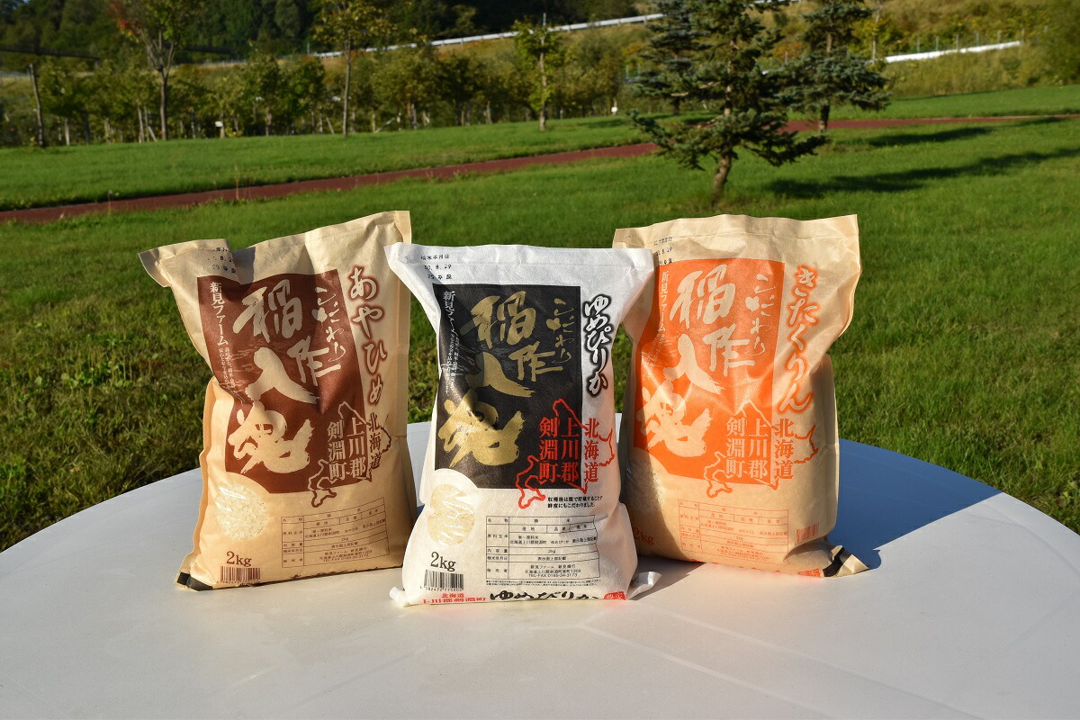 「ゆめぴりか」、「きたくりん」、「あやひめ」の3種のお米の食べ比べセットです。ゆめぴりかは、強い粘り気で甘みがとてもあるので冷めてもおいしいです。きたくりんは、農薬を極力減らし、安心・安全でありながらおいしいお米です。あやひめは、米粒の光沢が美しく、もちもちとした食感が良いお米です。
