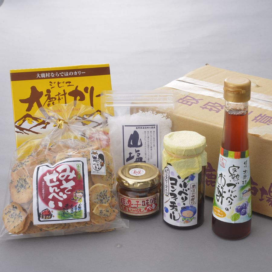 大鹿村の特産品詰め合わせセットをお届けします。時期によってセット内容は異なります。唐辛子みそ、山塩、山塩飴、ジビエカリーなどからお届けします。